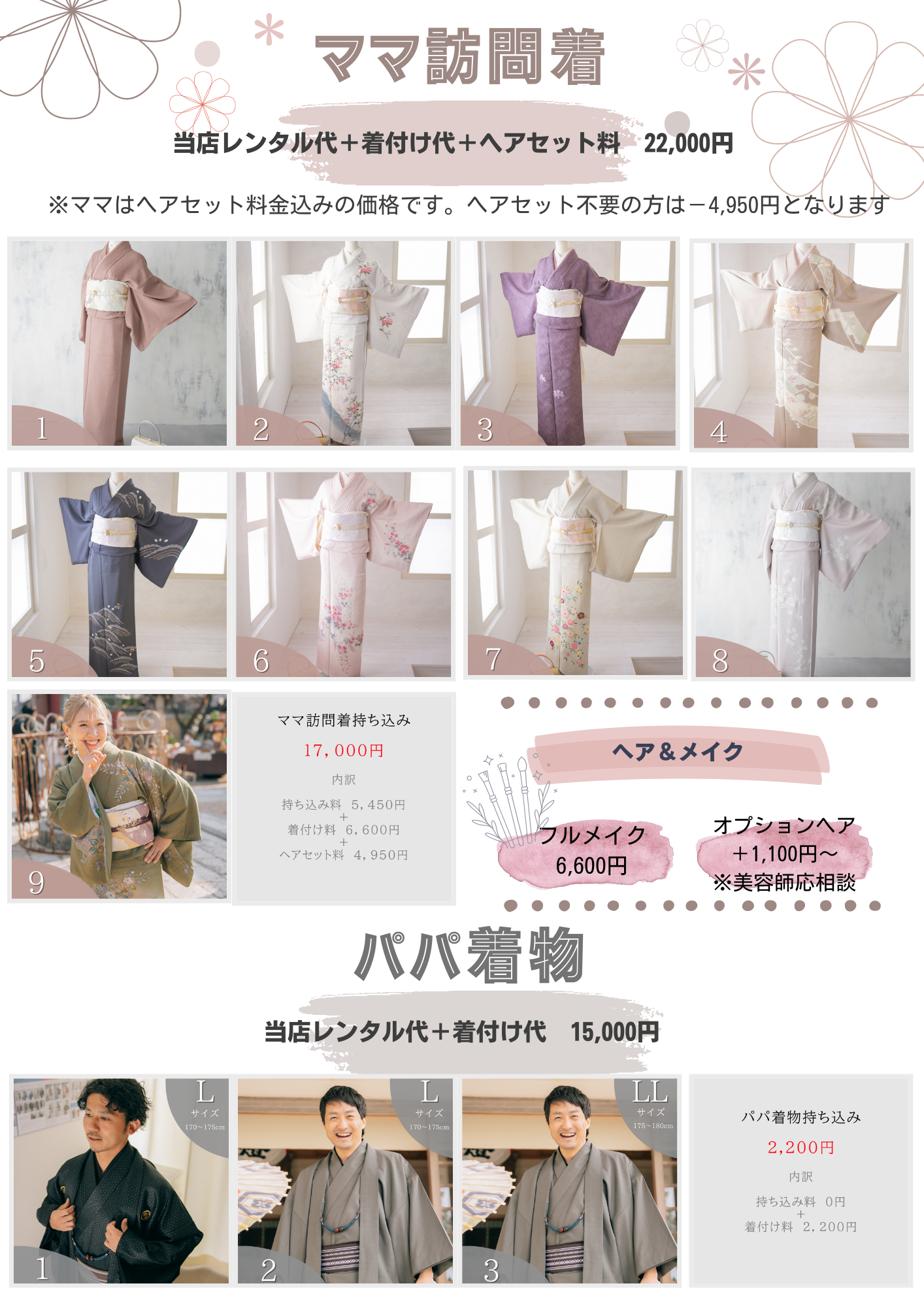 オプション情報 前へ 12 産着レンタル ※料金は詳細をご確認ください ◆産着レンタル料金◆(帽子・よだれかけセット)□11,000円【ニューボーン撮影された方限定料金】□スタジオお宮参り撮影場合のみ 5,500円※神社ロケの場合は11,000円となります□帽子・よだれかけのみレンタルの場合 3,850円 訪問着レンタル 10450円 ◆訪問着レンタル料 10450円 前へ 12